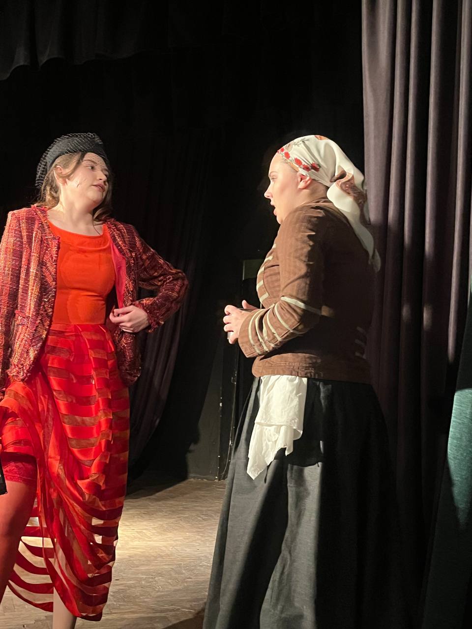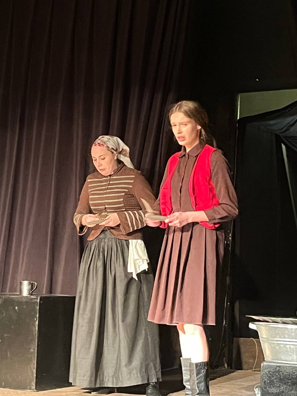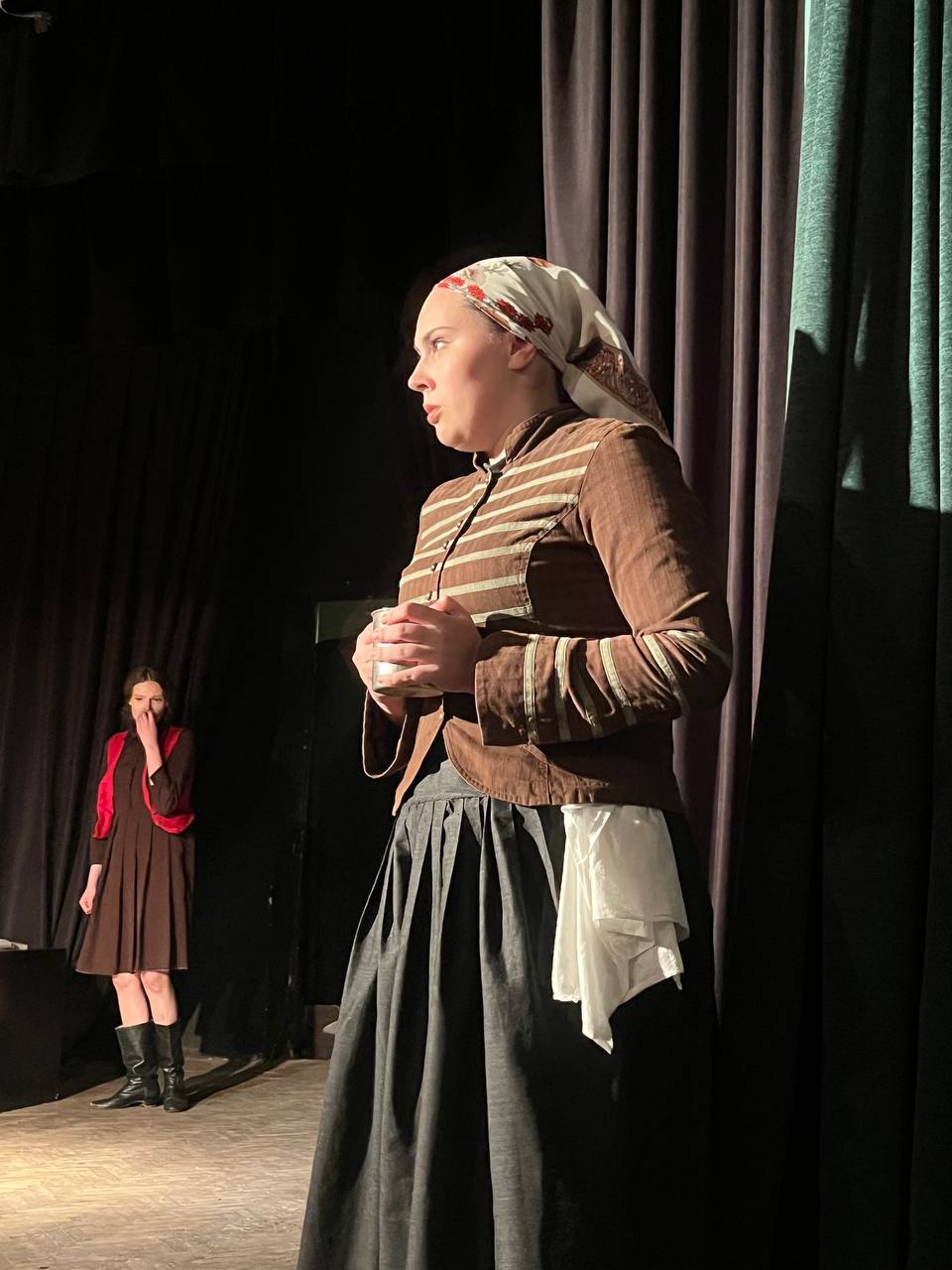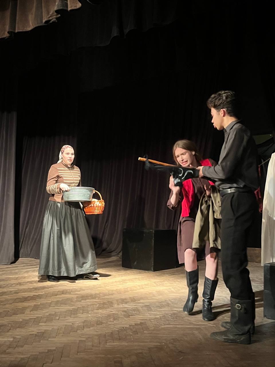 Третя інсценізація – уривок з п’єси Бертольда Брехта «Матінка Кураж та її діти». У цій роботі був використаний незвичайний прийом епічного театру Брехта – «відчуження», коли актори можуть виходити з образу просто на сцені й висловлювати власне ставлення до персонажа та його вчинків. У студентській постановці Матінка Кураж (Тетяна Смердова) зі своїми дітьми Швейцеркасом (Назар Прокопів), Катрін (Анастасія Янкова) і військовим священником (Єгор Колотурський), що переховується на ворожій території, втрачають полкову касу Другого Фінляндського полку, скарбником якого є Швейцеркас.