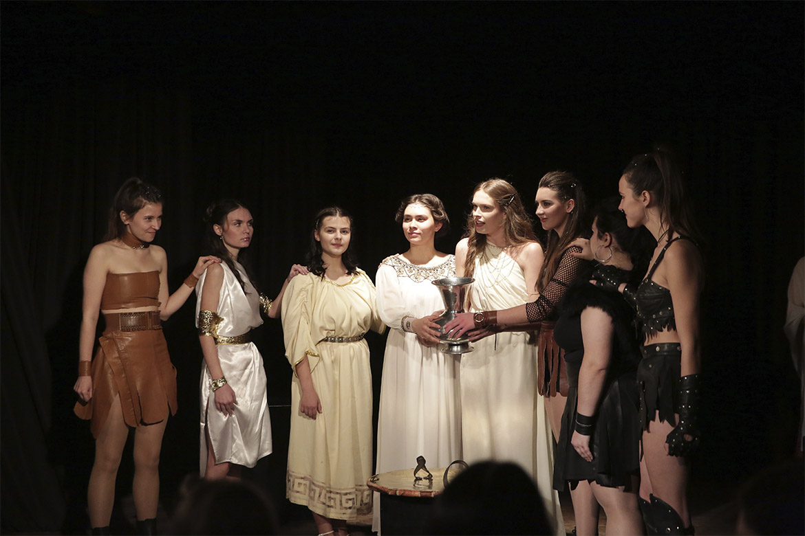 Для цього вона скликала «перших леді» двох таборів – афінян і спартанців, на чолі яких стоїть Калоніка (Тамара Скоробагатько) і Лампіто (Юлія Гапончук). Така пропозиція була не всім красуням до душі, але Лісістраті все ж вдалося вмовити жіноцтво, і вони всі разом увійшли в Акрополь. Завершили постановку студентки запальним танцем сиртакі в сучасній обробці, щоб таким чином повернути глядача в українські реалії.