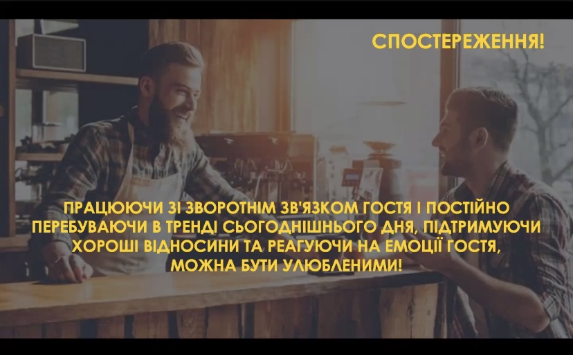 Навівши приклад зі свого життя про некомпетентність, неввічливість та невпевненість офіціантки, менторка порадила студентам вчитися приймати зауваження від гостей і колег, дякувати за них.