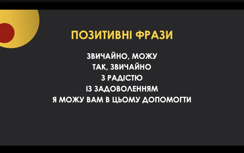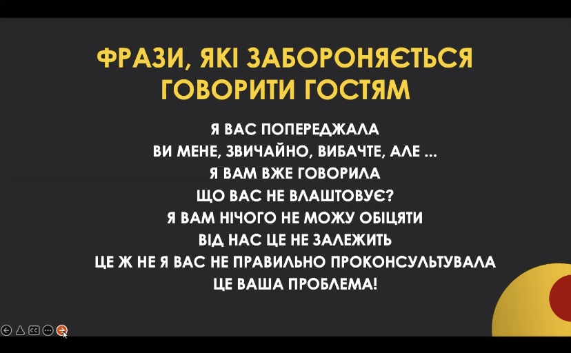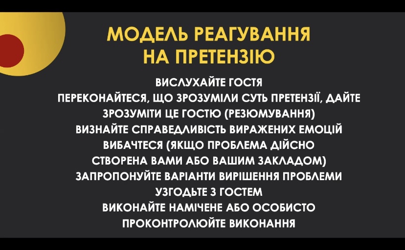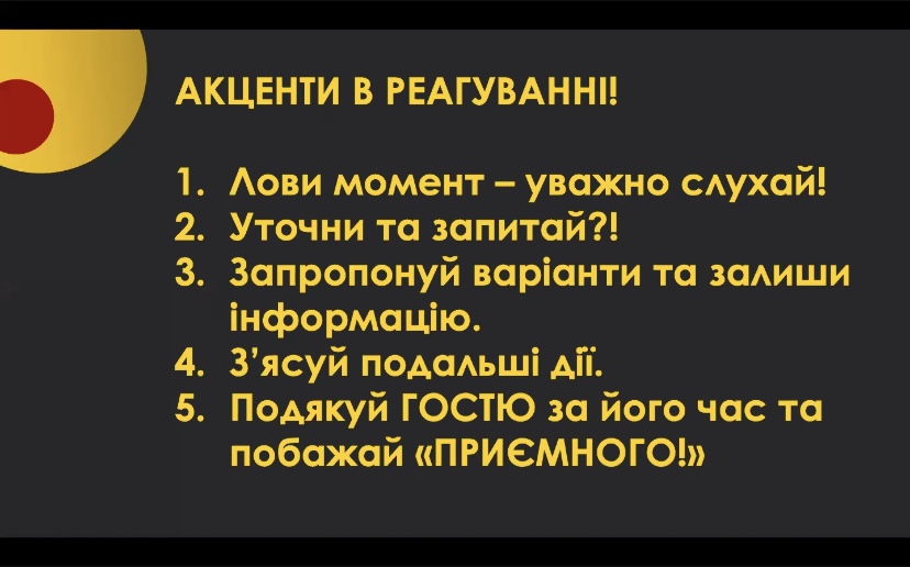 Окрім того, спікер запропонувала створювати нові професійні звички, а саме: знайомити зі своїм брендом, залишивши слід в душі та приємне враження; закохати гостя в ідею вашого проєкту; миттєво реагувати на питання чи нестандартні ситуації; завжди знаходити рішення; ділитися позитивними новинами та дякувати один одному.