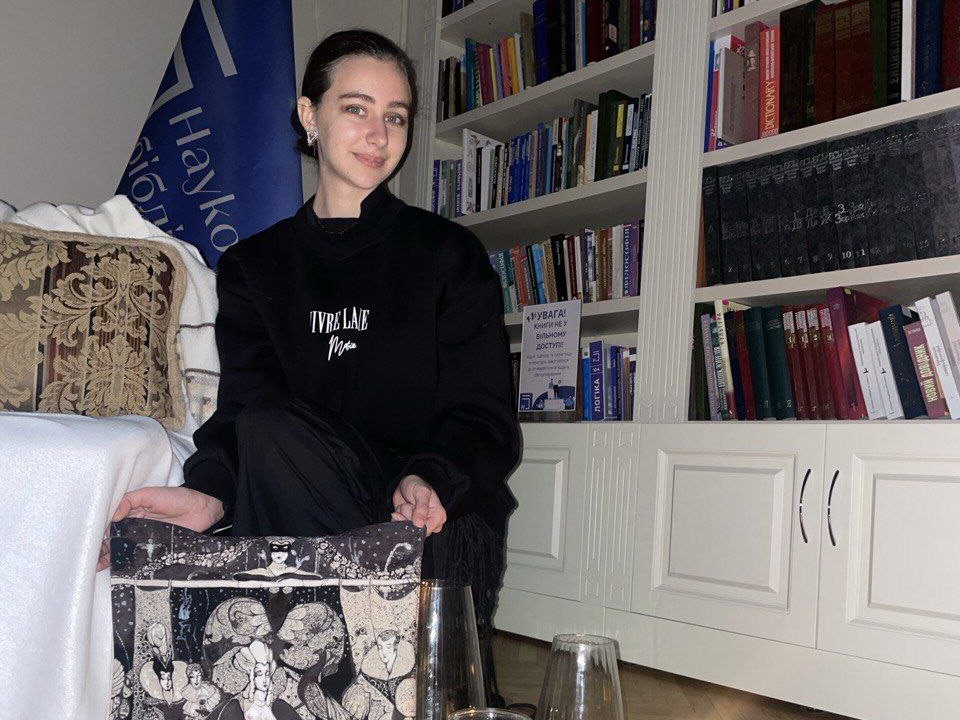 Вона принесла екосумку з графічним малюнком, створеним за мотивами картини українського художника-декадента Всеволода Максимовича «Карнавал».