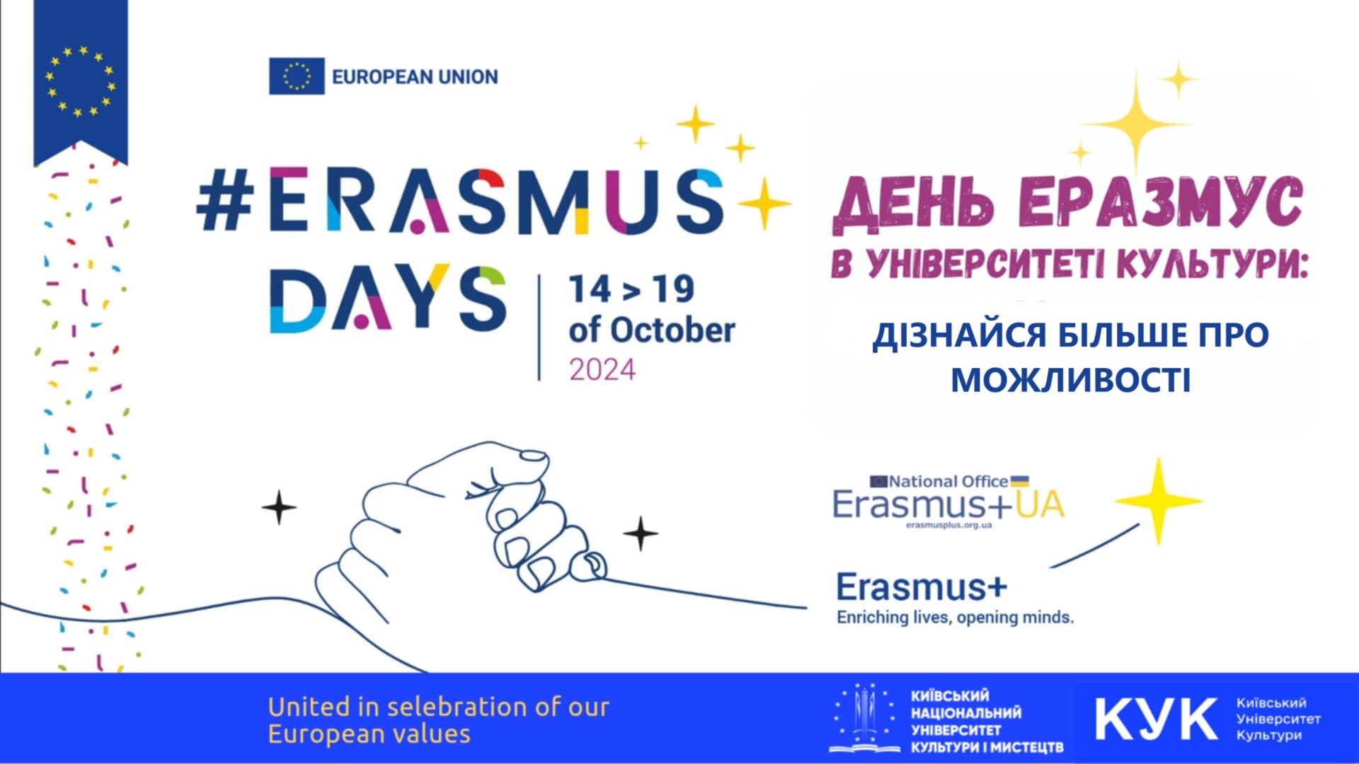 Відділ з міжнародних зв’язків долучається до ініціативи #ErasmusDays та запрошує відвідати «День Еразмус+ у КНУКіМ», що відбудеться 17 жовтня 2024 року, о 16.00.