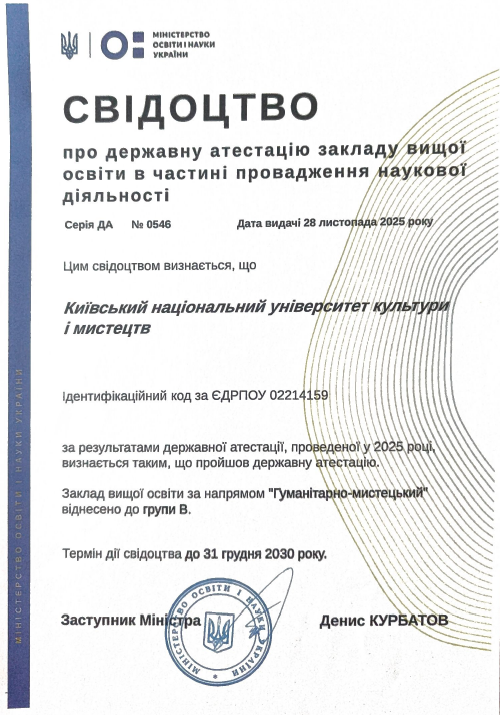 Відповідно до наказу Міністерства освіти і науки України від 28.11.2024 № 1675 «Про забезпечення організації та проведення у 2024–2025 роках державної атестації наукових установ та закладів вищої освіти в частині провадження такими закладами наукової та науково-технічної діяльності» Київський національний університет культури і мистецтв пройшов атестацію за науковим напрямом «Гуманітарно-мистецький» і отримав групу В (Свідоцтво про проходження держатестації Серія ДА № 0546)