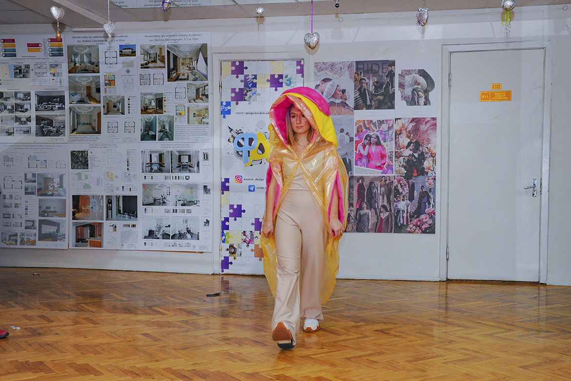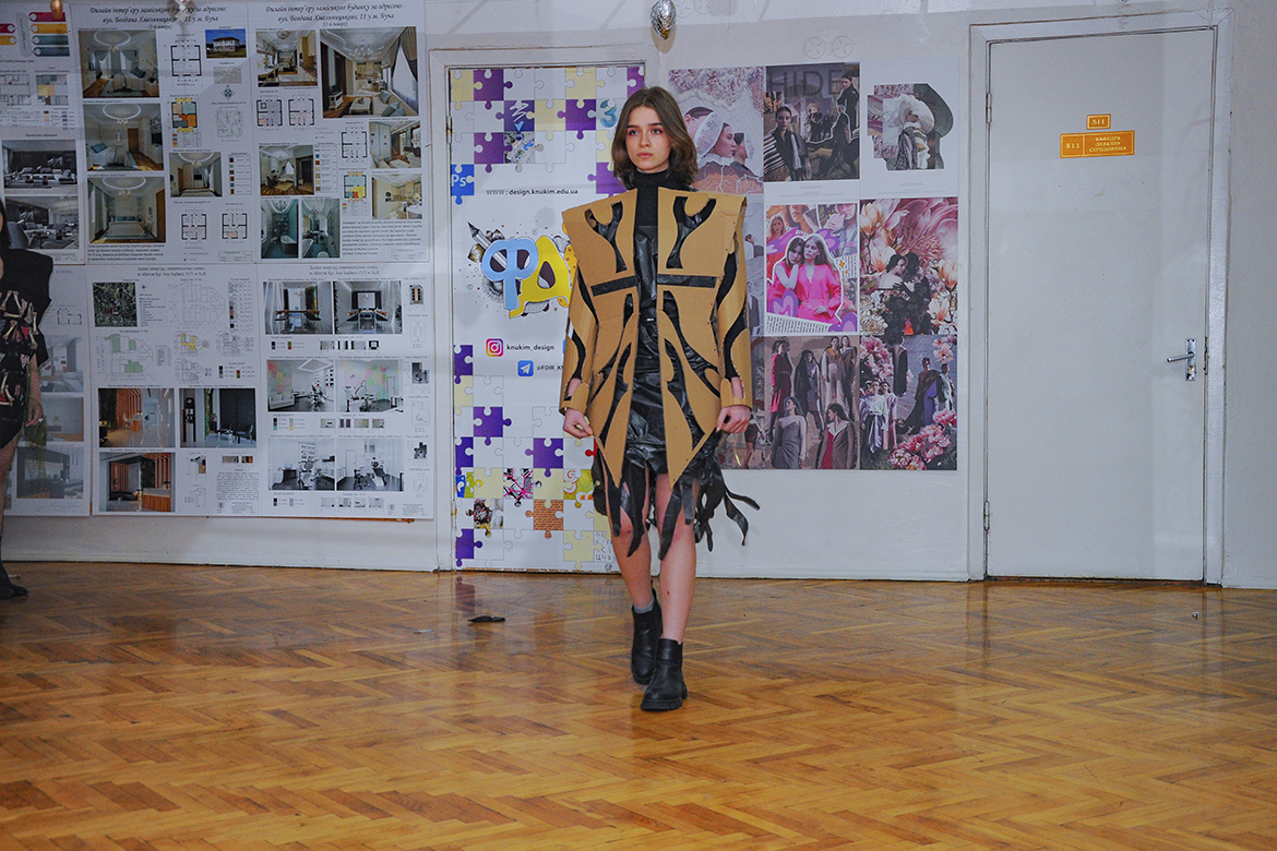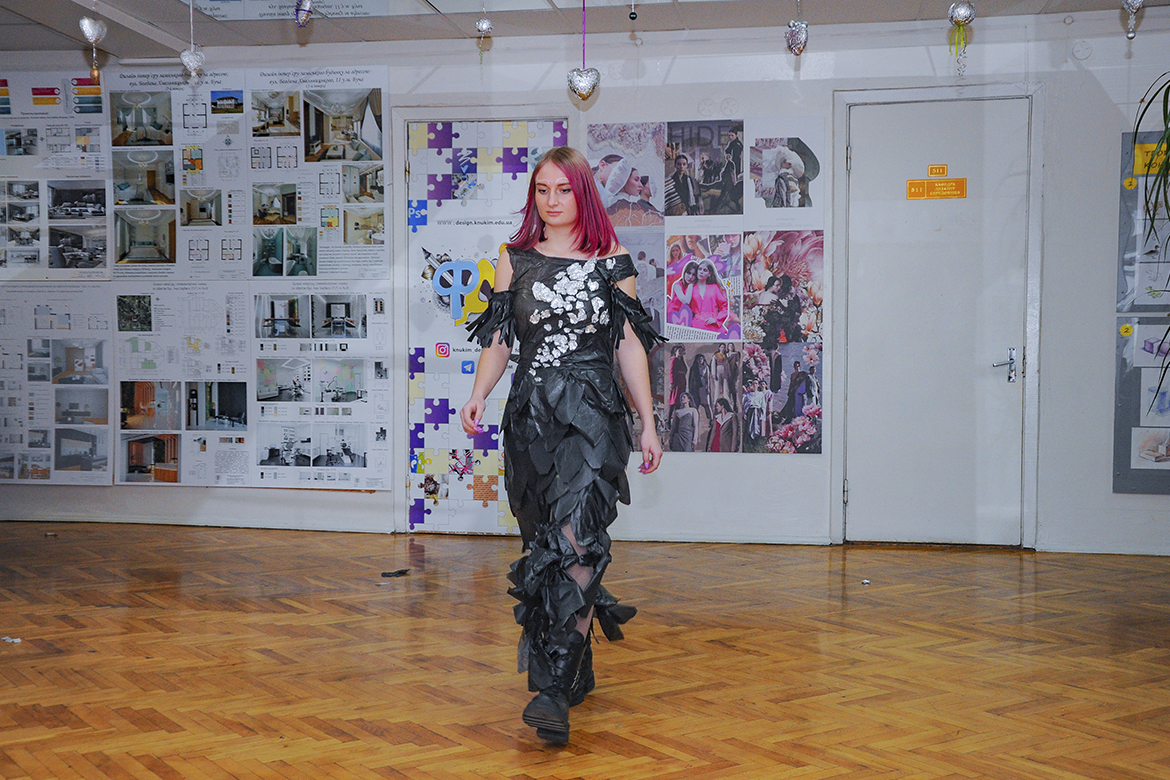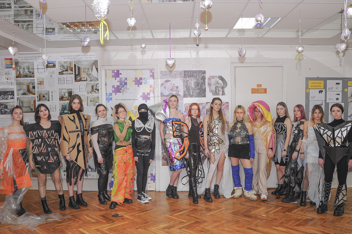 Колекцію вбрання з поліетилену, пластику та паперу представили першокурсники спеціалізації «Дизайн одягу» факультету дизайну і реклами. Показ проєктів відбувався в рамках ознайомчої практики молоді, яка втілила цікаві дизайнерські рішення, надихаючись темою сучасних еко-трендів.