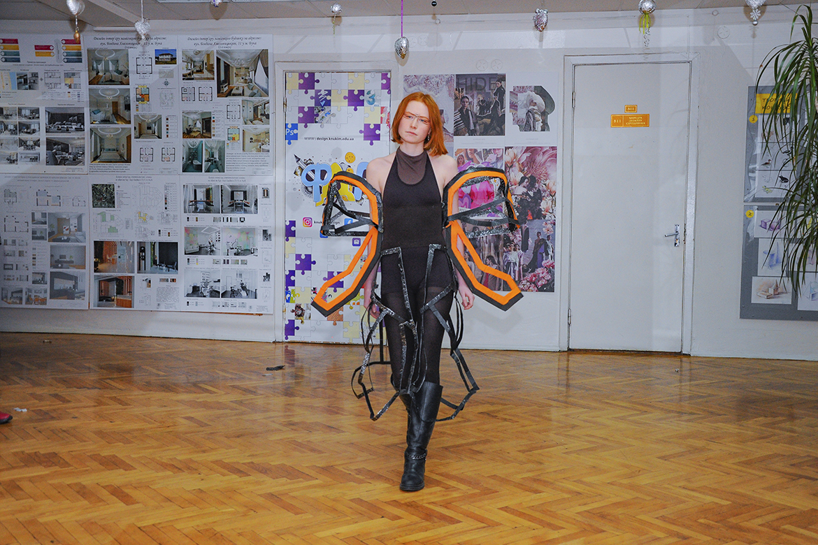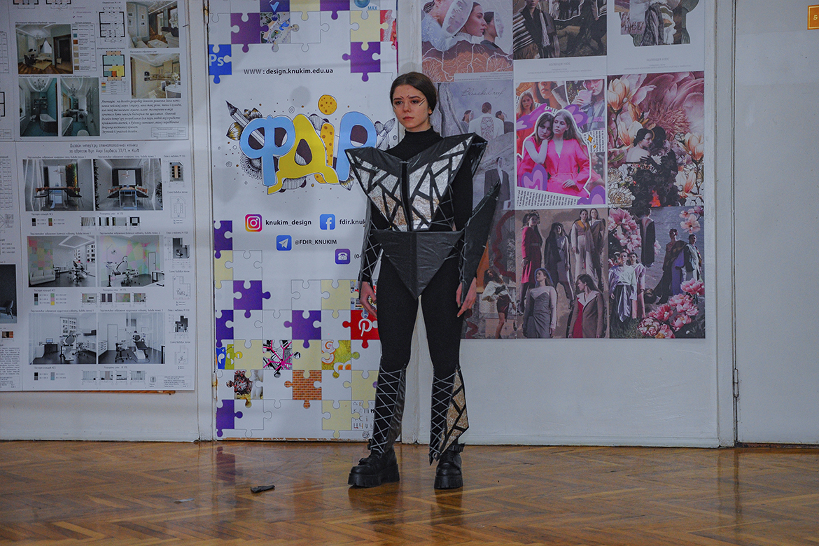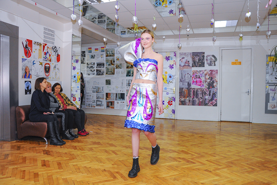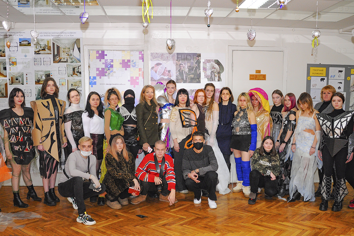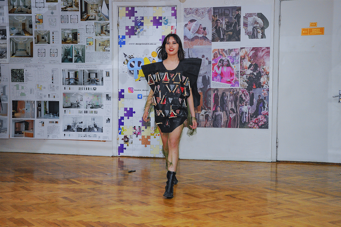 Колекцію вбрання з поліетилену, пластику та паперу представили першокурсники спеціалізації «Дизайн одягу» факультету дизайну і реклами. Показ проєктів відбувався в рамках ознайомчої практики молоді, яка втілила цікаві дизайнерські рішення, надихаючись темою сучасних еко-трендів.