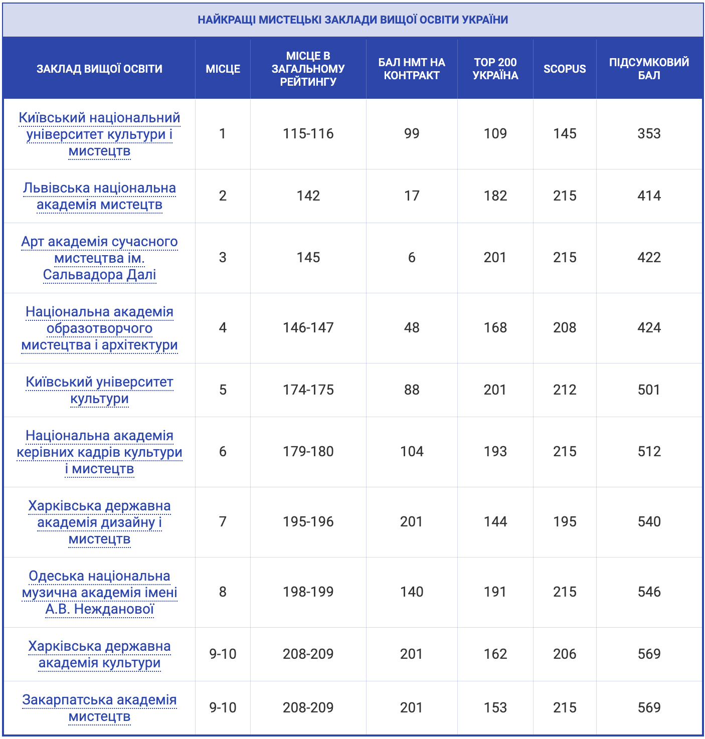 Інформаційний ресурс «Освіта.ua» представив мистецькі виші, які посіли найвищі місця в консолідованому рейтингу вищих навчальних закладів України 2024 року.