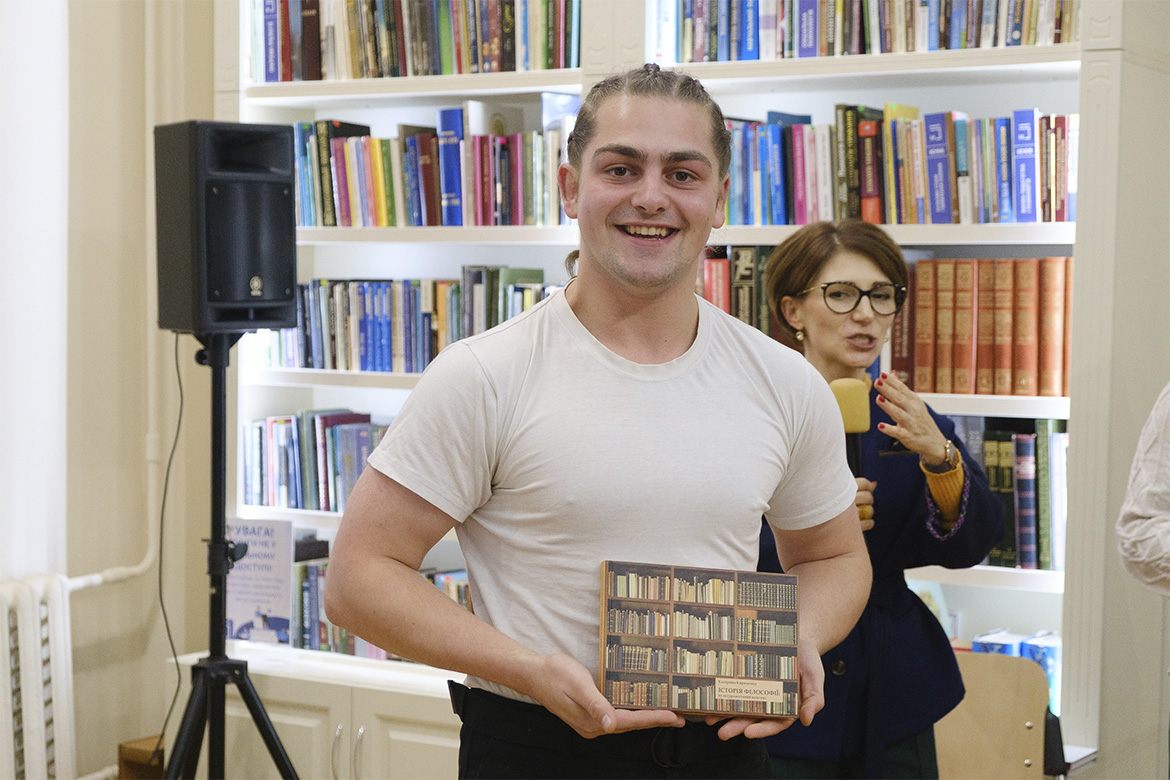 Інтелектуальні змагання в бібліотеці розпочалися з невеликої вікторини, під час якої учасникам треба було вирахувати суму чисел у році народження Григорія Сковороди та вгадати, хто з відомих філософів був двічі олімпійським чемпіоном, а хто, маючи слабке здоров’я, зміг прожити майже 80 років завдяки чіткому розкладу дня та активній роботі впродовж всього життя. Ті, хто першими правильно відповіли на запитання, отримали у подарунок книжку «Філософська абетка» та солодкі подарунки.