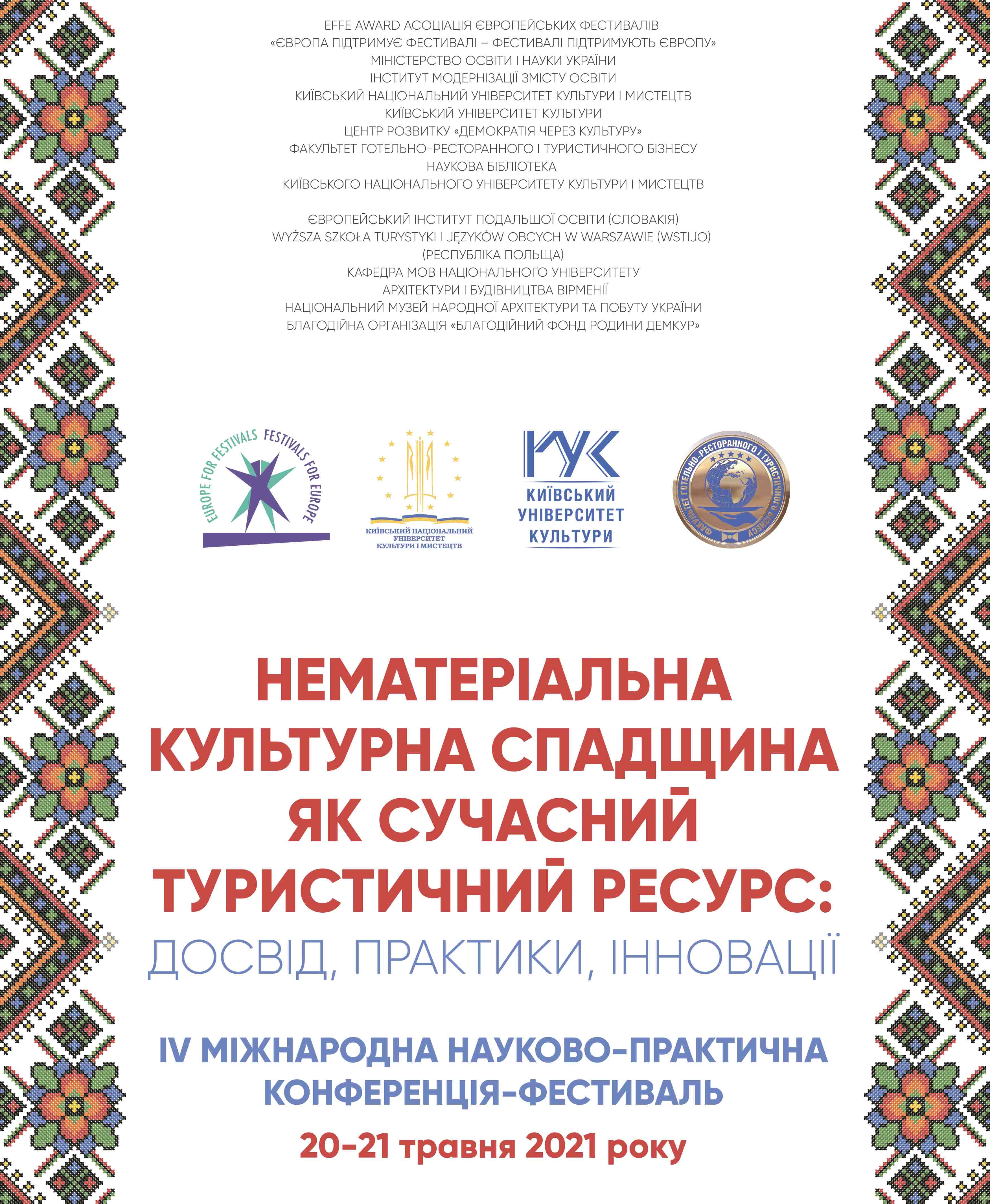 Міжнародна науково-практична конференція-фестиваль «Нематеріальна культурна спадщина як сучасний туристичний ресурс: досвід, практики, інновації» проводиться на виконання Конвенції ЮНЕСКО «Про охорону нематеріальної культурної спадщини», Законів України: «Про приєднання України до Конвенції про охорону нематеріальної культурної спадщини», «Про туризм», Стратегії розвитку туризму та курортів на період до 2026 року, інших нормативно-правових актів та з метою здійснення комплексного наукового огляду сучасного стану елементів нематеріальної культурної спадщини як національного туристичного ресурсу в Україні та за кордоном із залученням зусиль науковців, аспірантів, студентів України та зарубіжних країн, які досліджують актуальні проблеми туристичної галузі, культурології, філософії, фольклористики, мистецтвознавства, музеєзнавства, педагогіки, психології та економіки, фольклорних колективів та майстрів народної творчості.