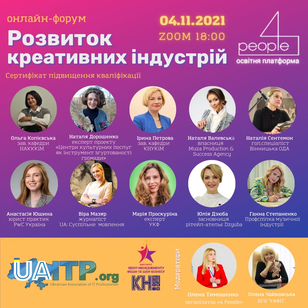 У рамках спільного проєкту факультету івент-менеджменту, фешн і шоу бізнесу, кафедри комп’ютерних наук, освітньої платформи «4 People» і ВГО «УАФІТ» відбувся онлайн-форум на тему «Розвиток креативних індустрій».