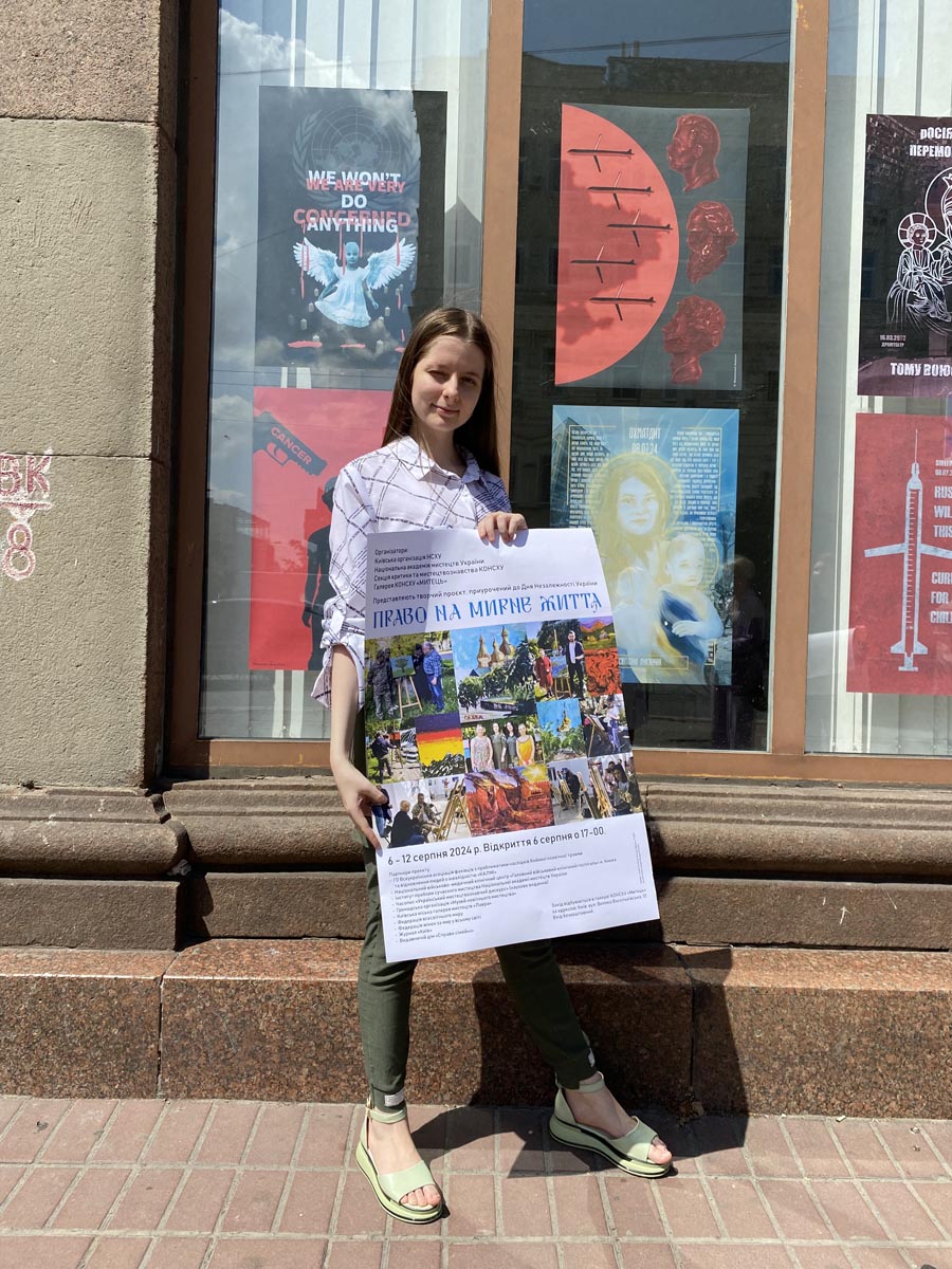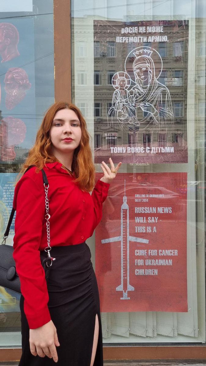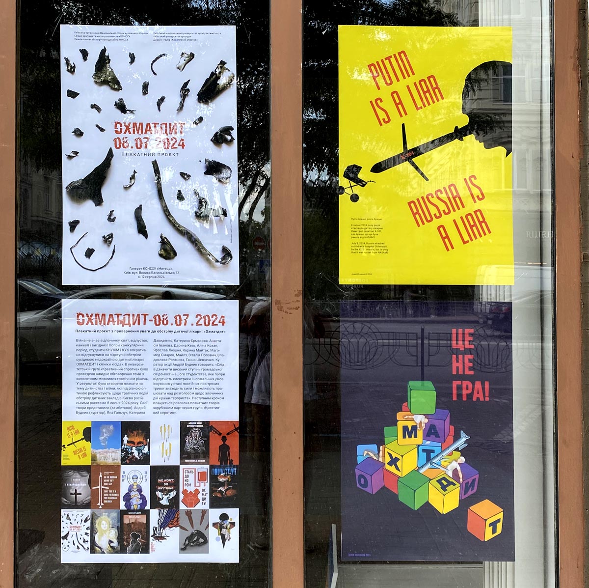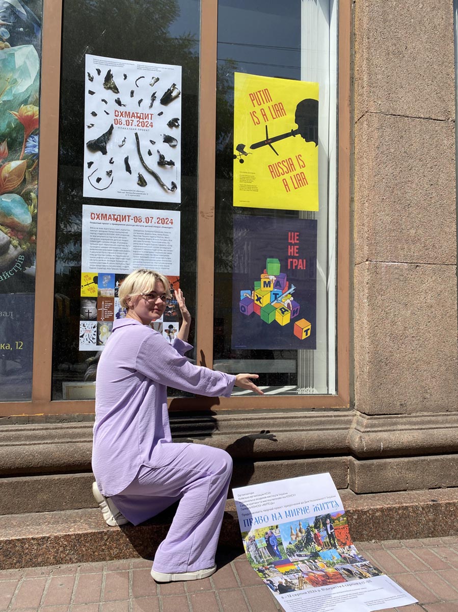 Війна не знає відпочинку, свят, відпусток і вихідних! Попри канікулярний період, студенти КНУКіМ оперативно відгукнулися на підступні обстріли сусідньою недокраїною дитячої лікарні «ОХМАТДИТ» і репродуктивної клініки «Ісіда». Одразу після ракетної атаки в дизайн-групі «Креативний супротив» КНУКіМ було проведено швидке обговорення з виявленням можливих графічних рішень, сформована концепція акції, оглянуто локацію для майбутньої експозиції. У результаті 16 авторів створили 20 плакатів і 1 відео на тему дитинства і війни, які мають привернути увагу світової спільноти до трагічних подій – обстрілу дитячих закладів Києва російськими ракетами 8 липня 2024 року.