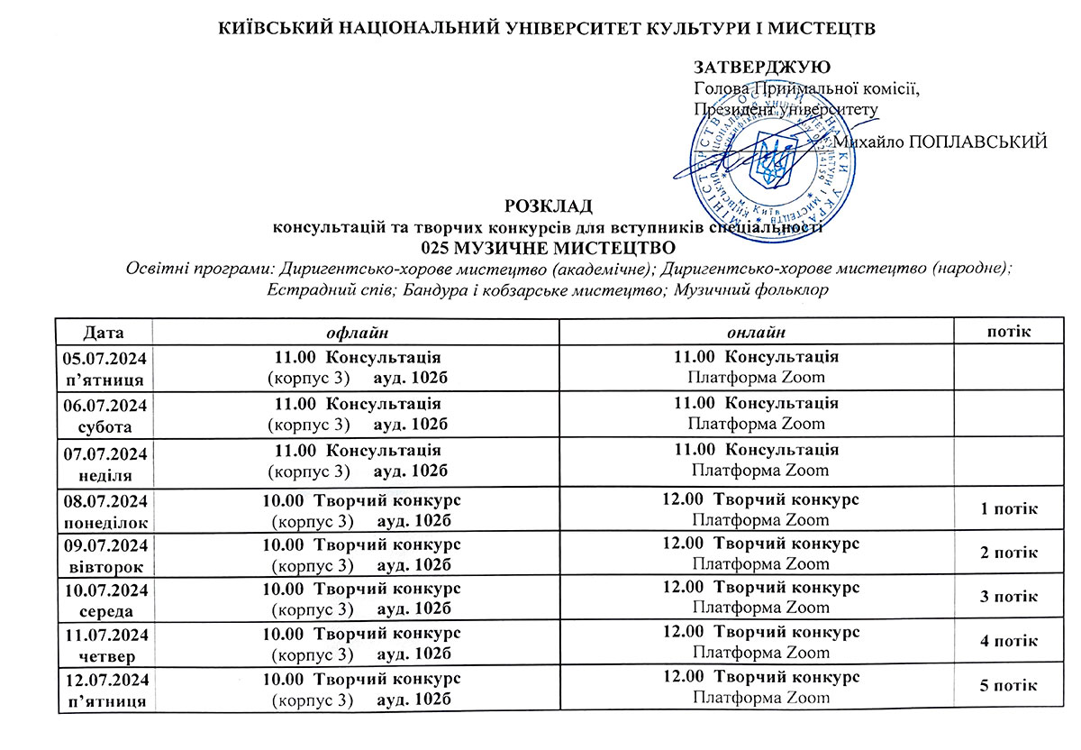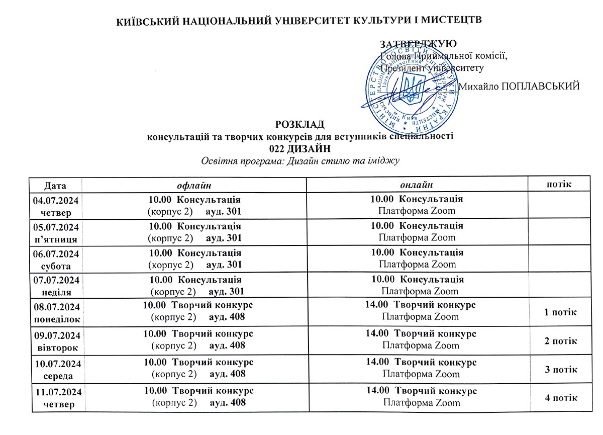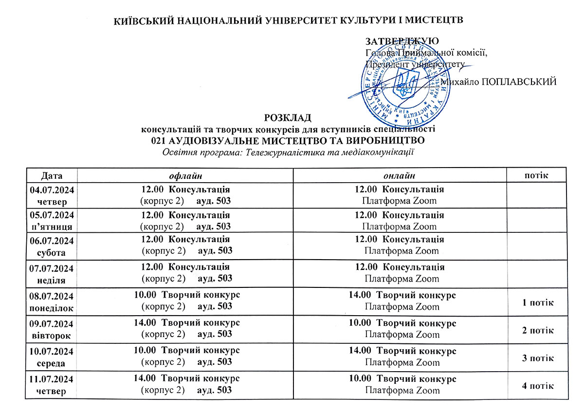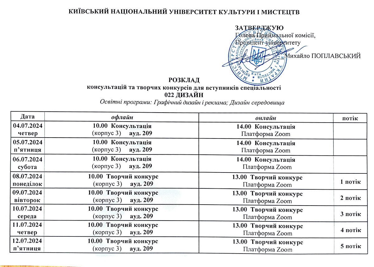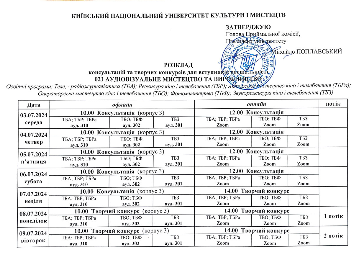 Розклад консультацій та творчих конкурсів/Бакалаврат