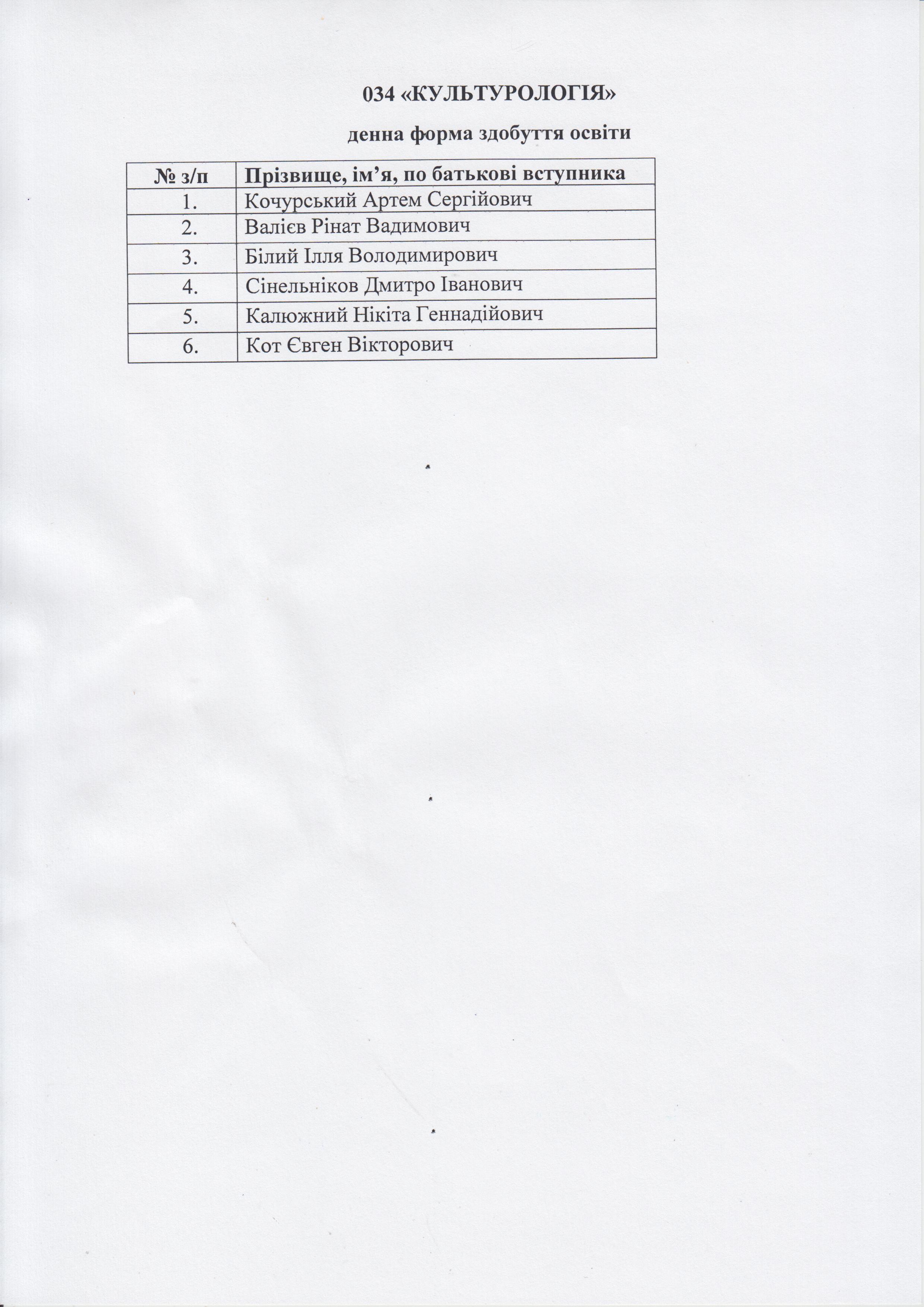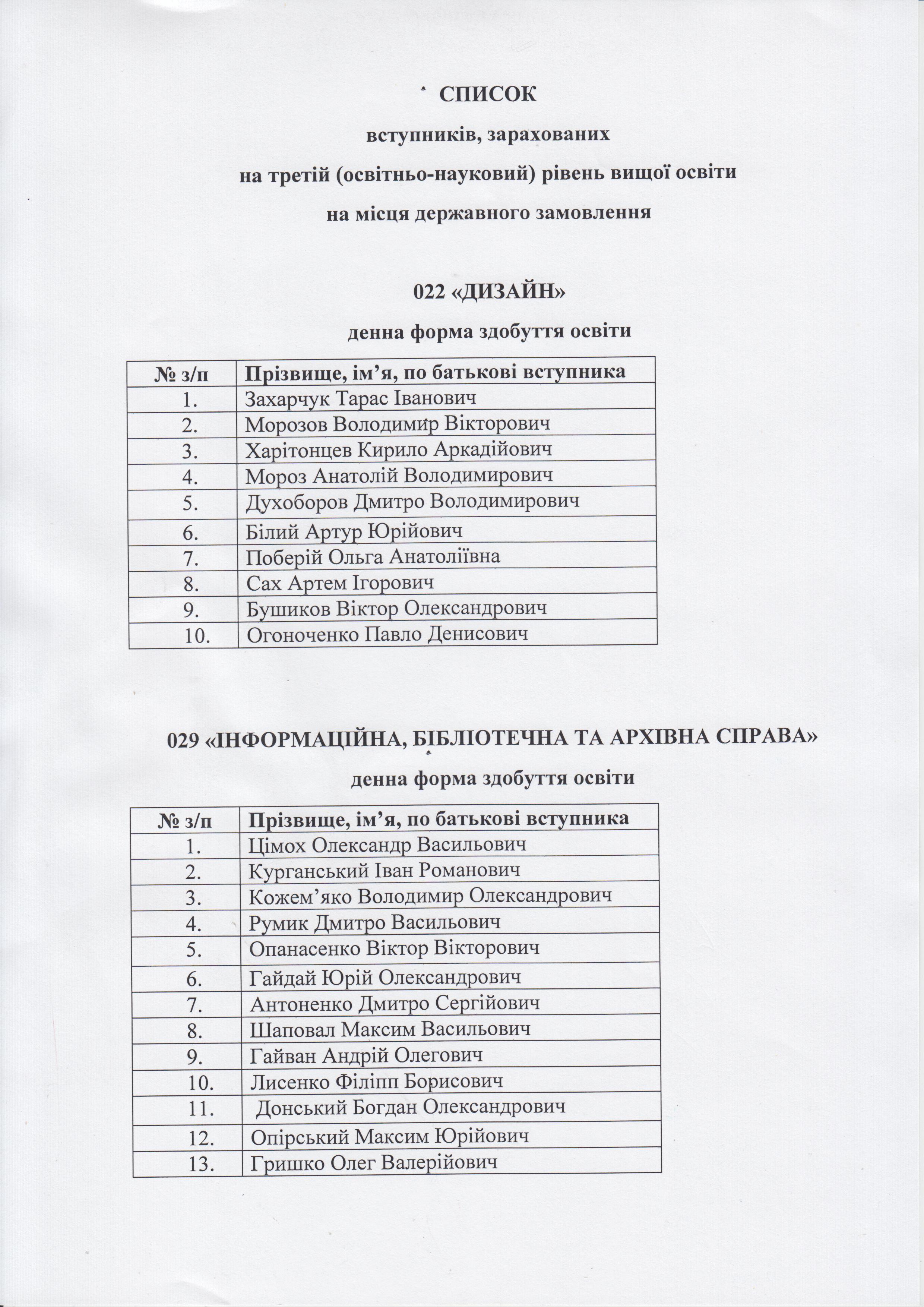 СПИСОК вступників, зарахованих на третій (освітньо-науковий) рівень вищої освіти на місця державного замовлення