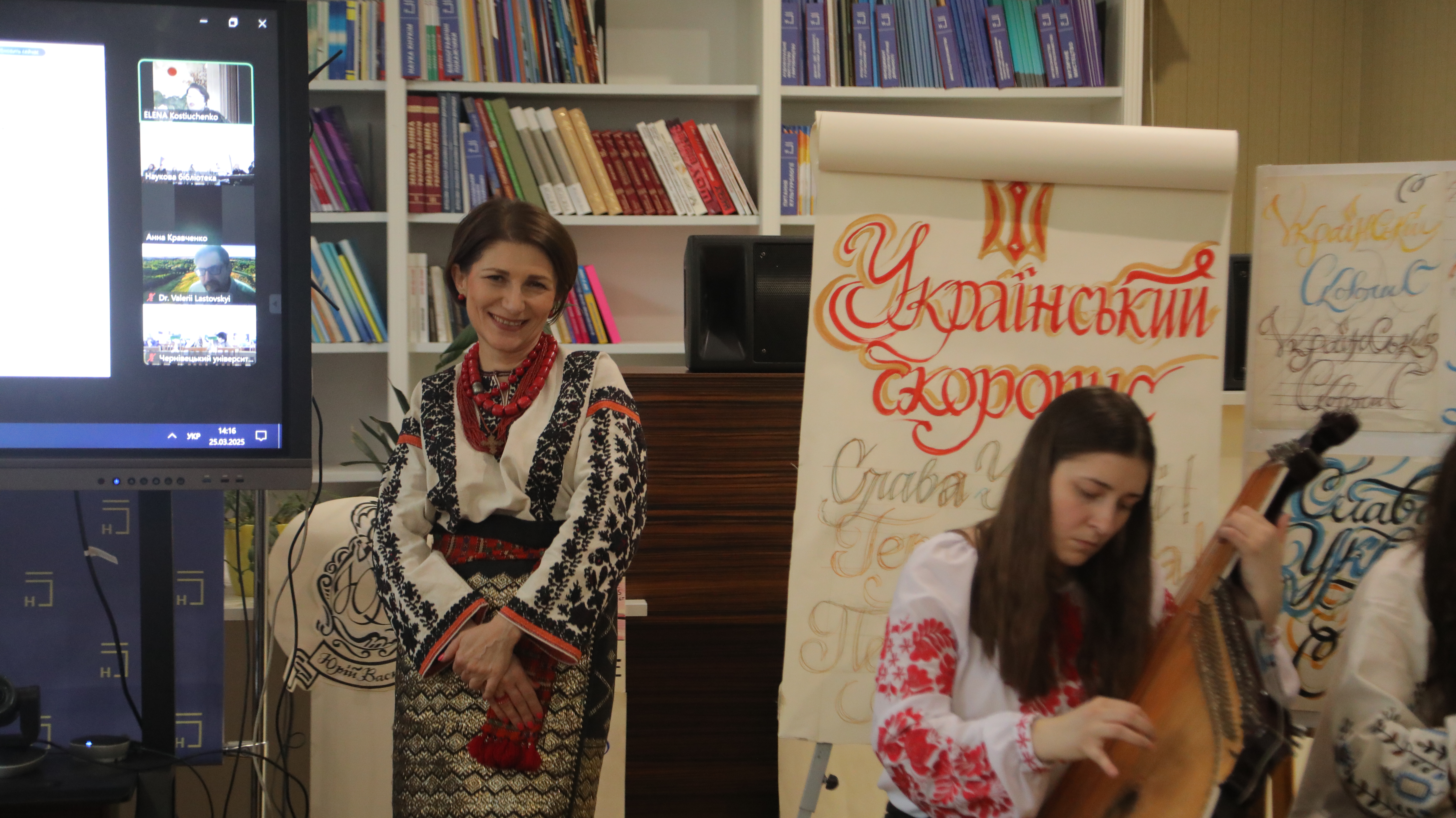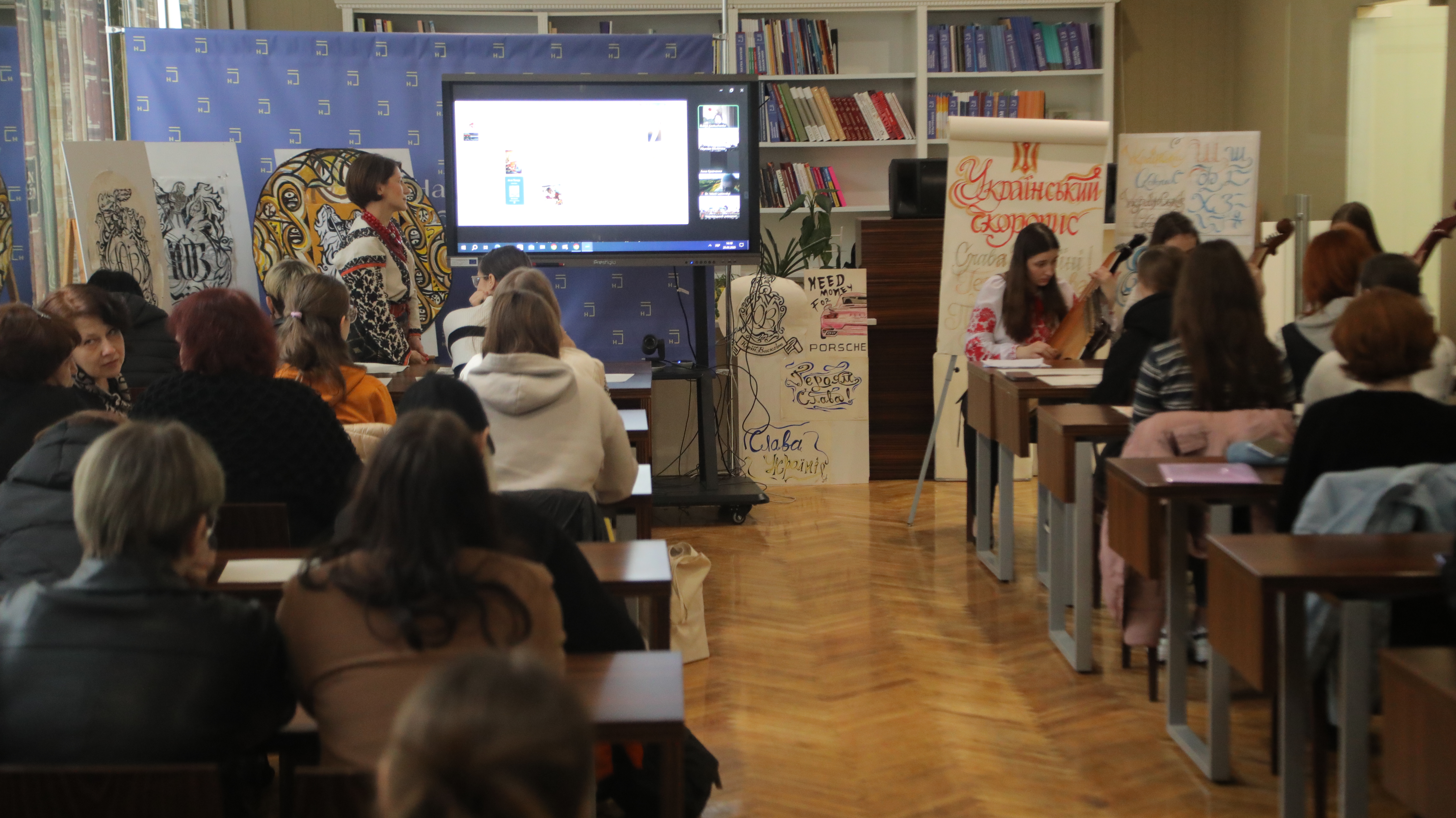 Захід відбувся в змішаному форматі: університетська спільнота КНУКіМ насолоджувалася синергією імерсивного мистецького досвіду в читальній залі бібліотеки, учасники з Харкова, Дніпра і Чернівців долучилися у форматі Zoom-конференції.