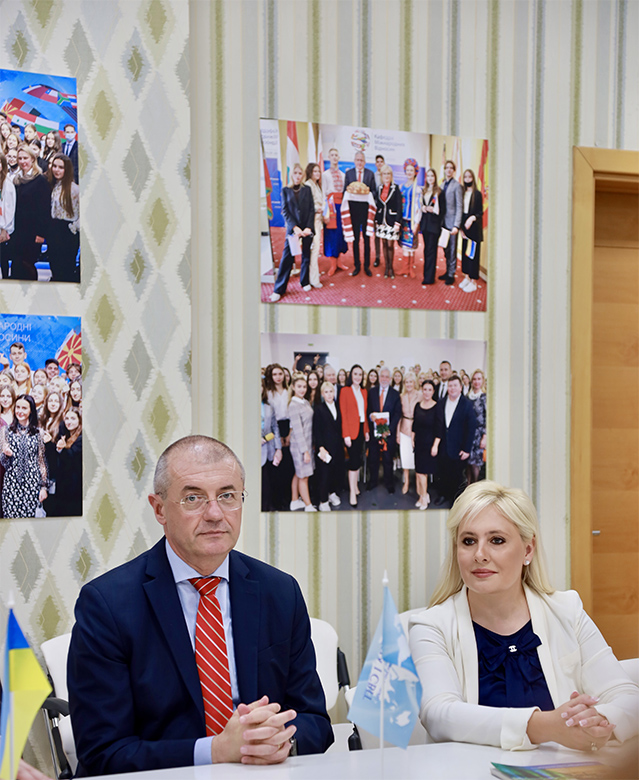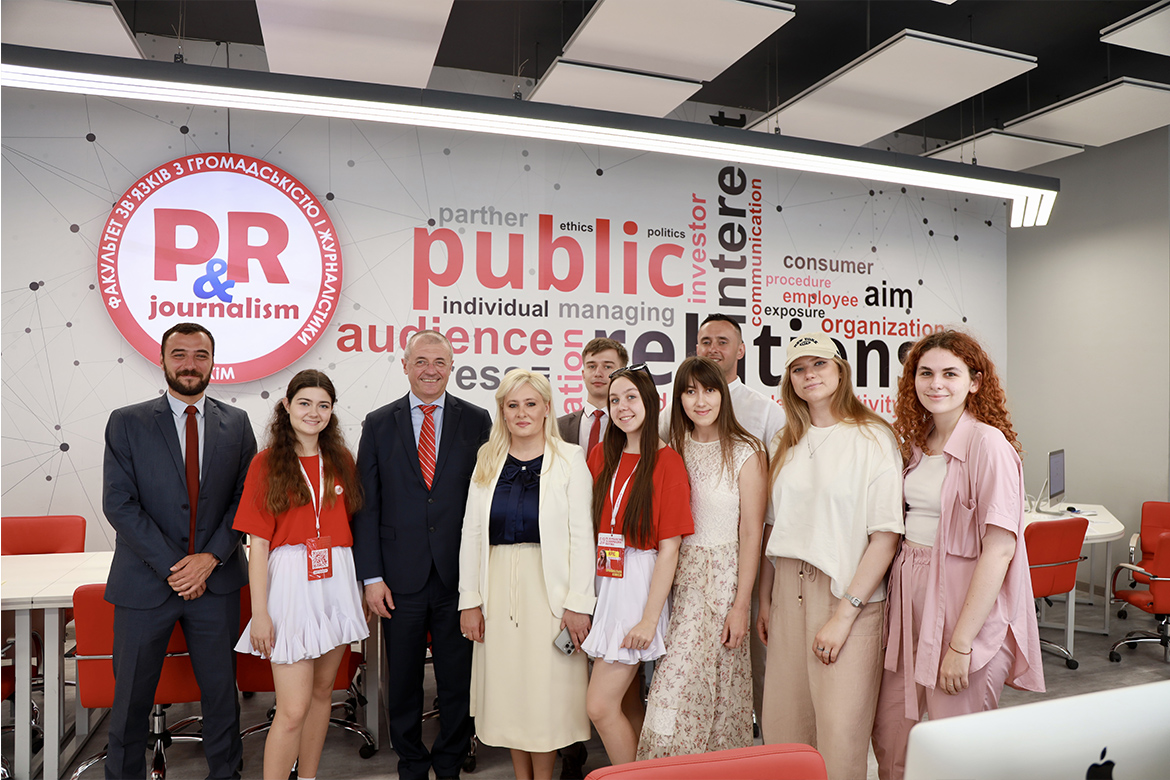 Зустріч відбулась за участі президента КНУКіМ, доктора педагогічних наук, професора Михайла Поплавського і завідувачки кафедри міжнародних відносин, докторки політичних наук, професорки Інни Костирі, викладачів і студентів вишу.